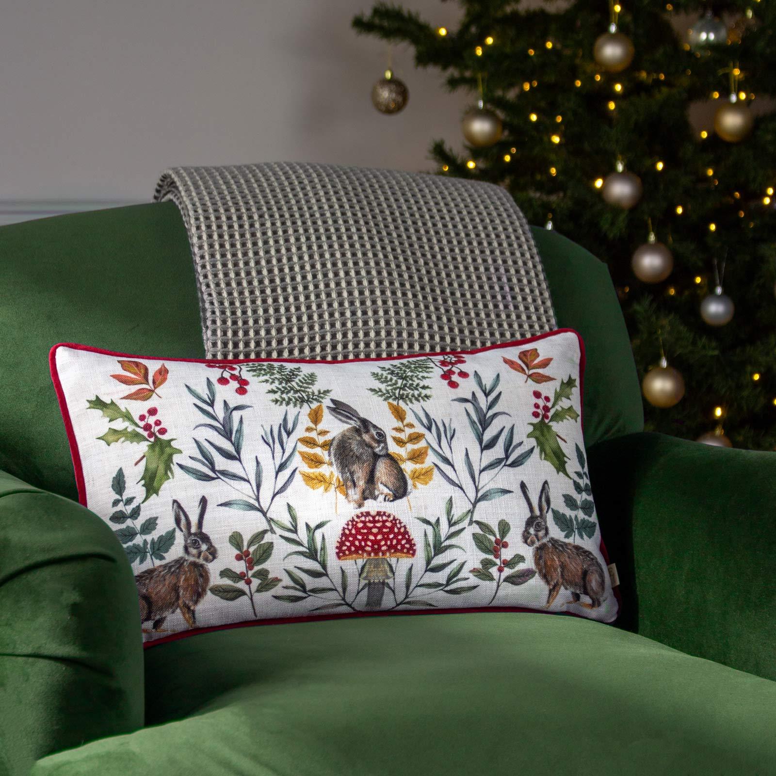 An adorable cushion cover featuring three posing winter hares among winter foliage and a toadstool, set on a fresh white background. The hand painted watercolour design is printed on soft polyester linen blend fabric, with a plush plain red velvet reverse, contrasting piped trim and zip fastening. Ideal for bringing a touch of nature to your home.