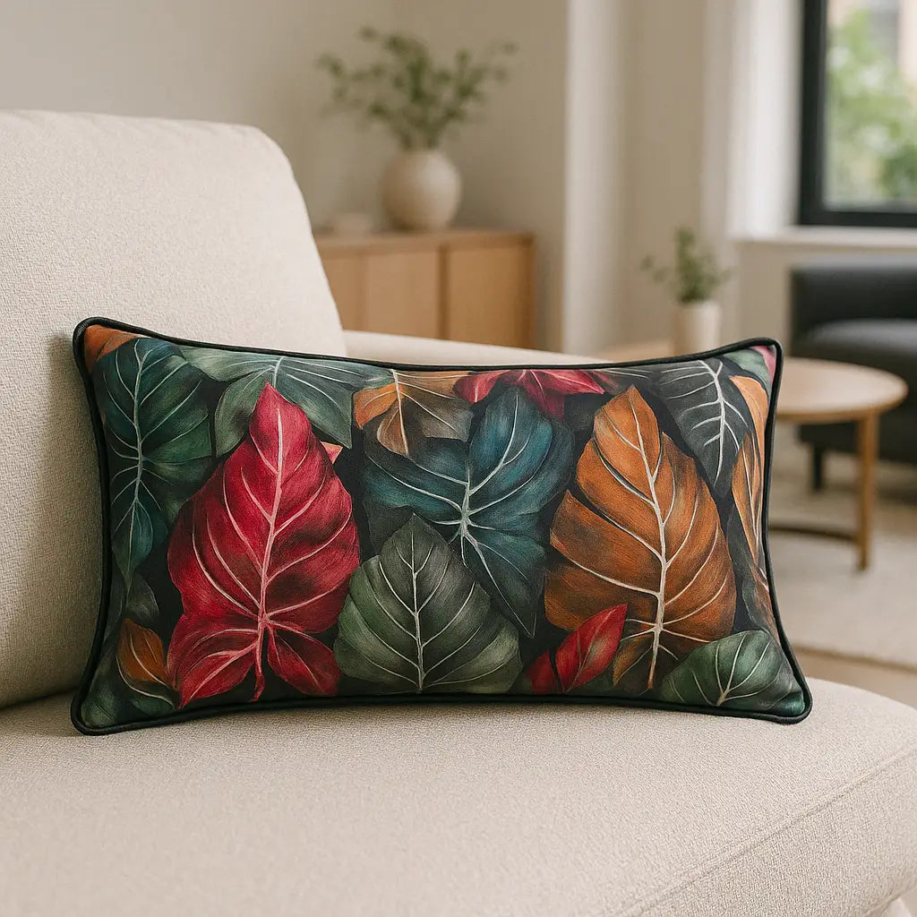 Add a touch of the tropics to your home furnishings with this stunning cushion cover. Its printed luxury velvet front design showcases vibrant botanical leaves in an array of vivid colours, elegantly set against a contrasting background. The cushion cover is beautifully finished with a plain velvet reverse, contrast piped trim, and a convenient zip fastening for easy removal and cleaning.