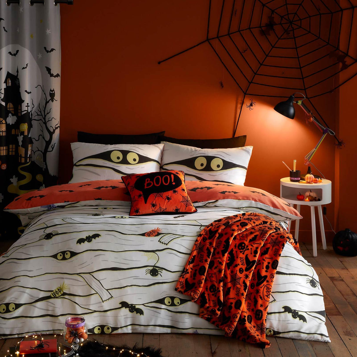 Get ready to embrace the Halloween spirit with our enchanting glow-in-the-dark bedding! This delightful duvet set, crafted from easy-care polycotton fabric, features playful designs of glowing eyes and friendly spiders, ensuring your bedtime is both fun and spooktacular. Just remember, no need to call for mummy!