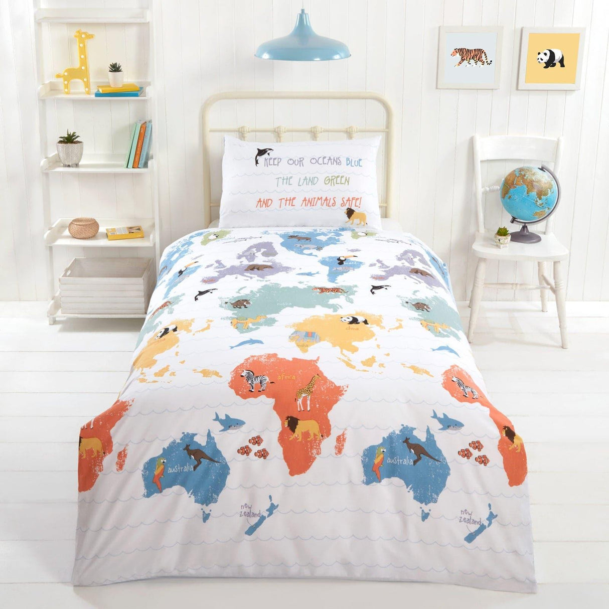Our Little Rapport Home range is made using sustainably sourced BCI cotton and recycled polyester. Designed by British designers, this duvet set shows the countries of the world and the indigenous animals specific to that country, perfect for your little one.