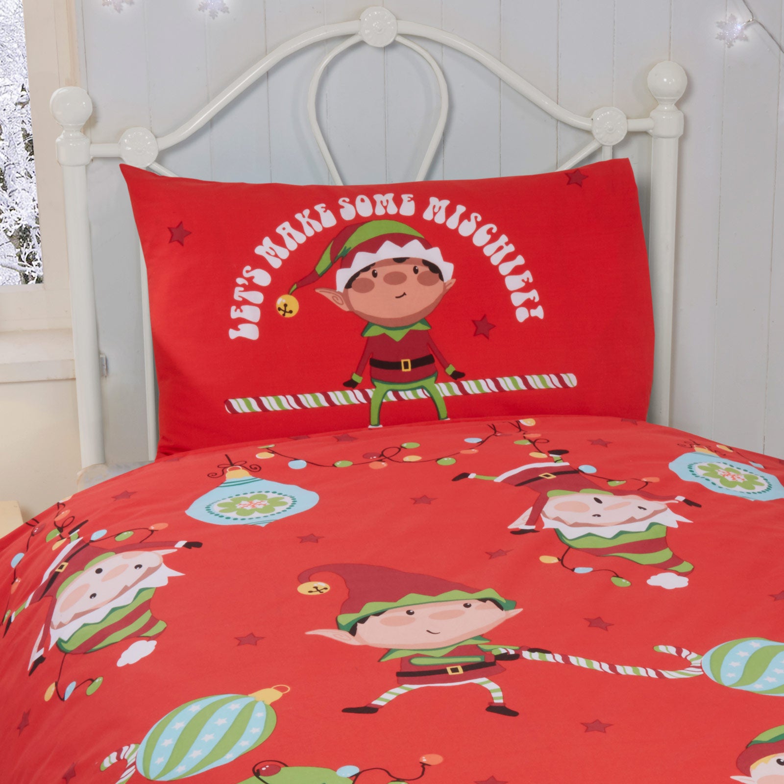 Add a touch of festive magic to any bedroom with this Naughty Elves duvet cover set. The fun design features a collection of cheeky elves swinging from fairy lights, riding on baubles and holding candy cane lollipops. All set against a traditional Christmas red background.