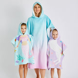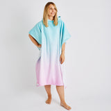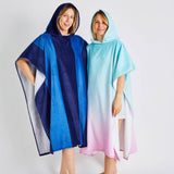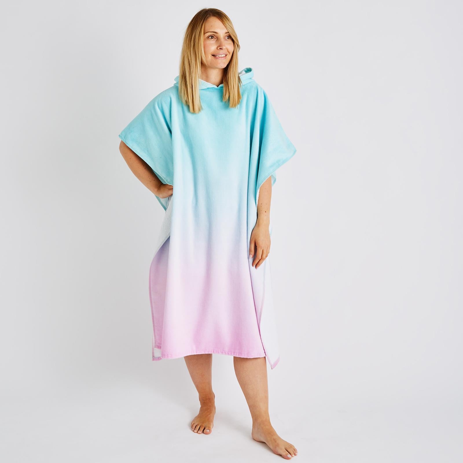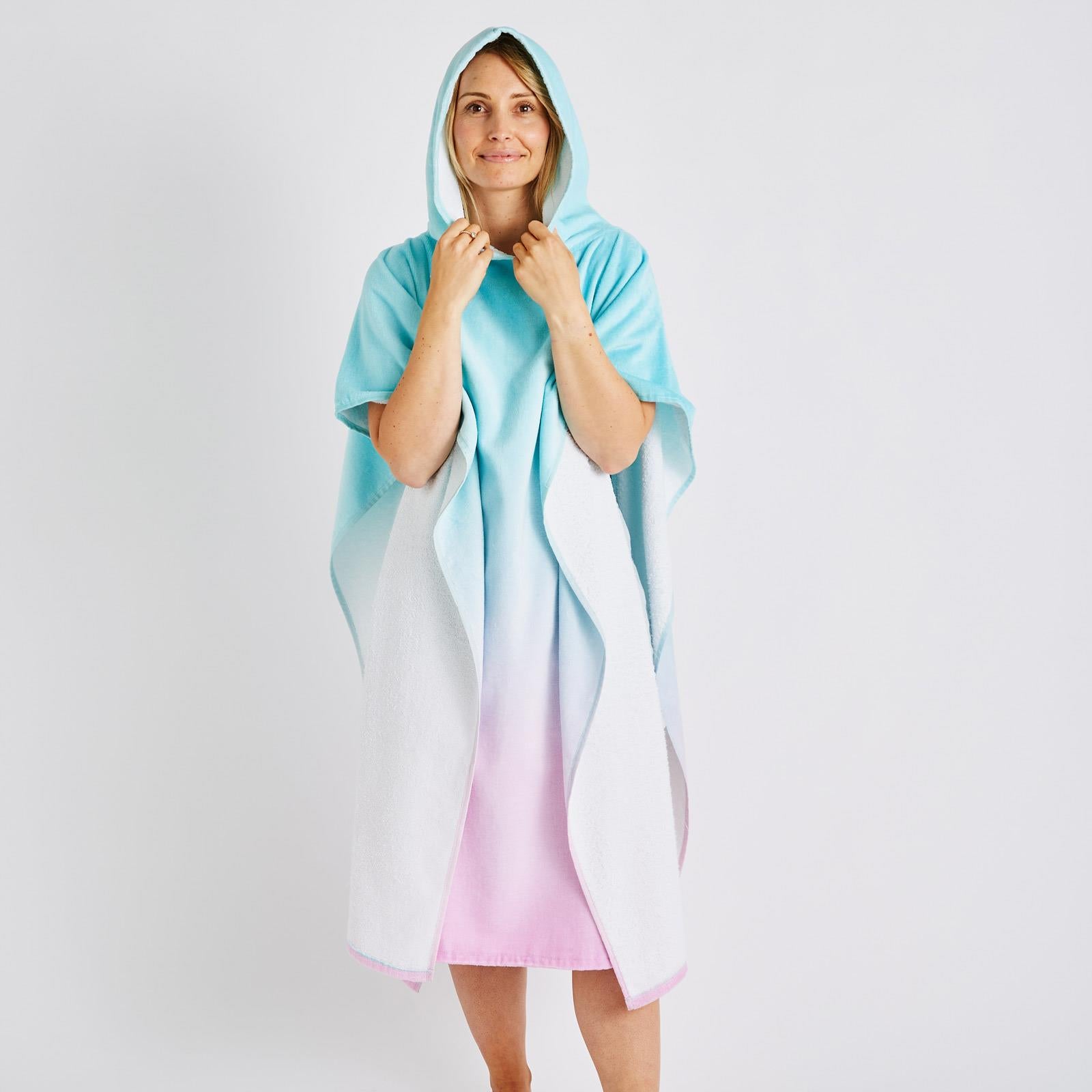 Step out in style with a pink to blue ombre with towelling adult size poncho. Crafted from soft and absorbent cotton towelling fabric, it quickly dries them off after water play while keeping you warm and cosy. Designed for convenience, the over-the-head hooded style makes it easy to slip on and off after a day at the pool or beach or after a long bath.