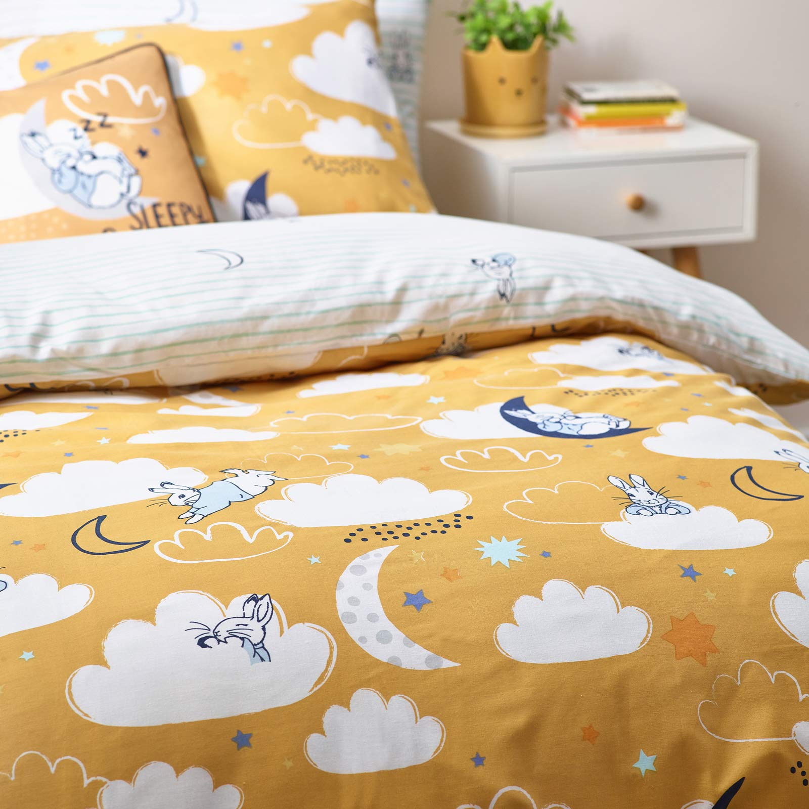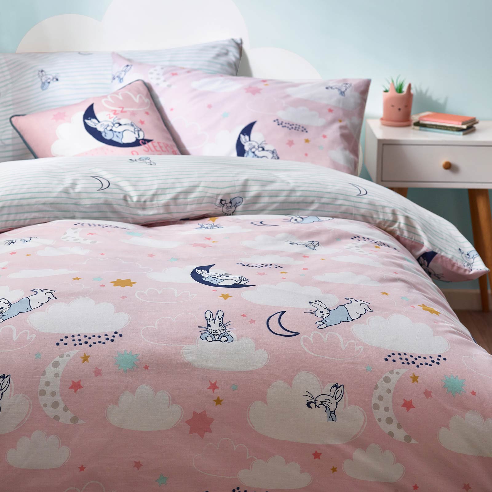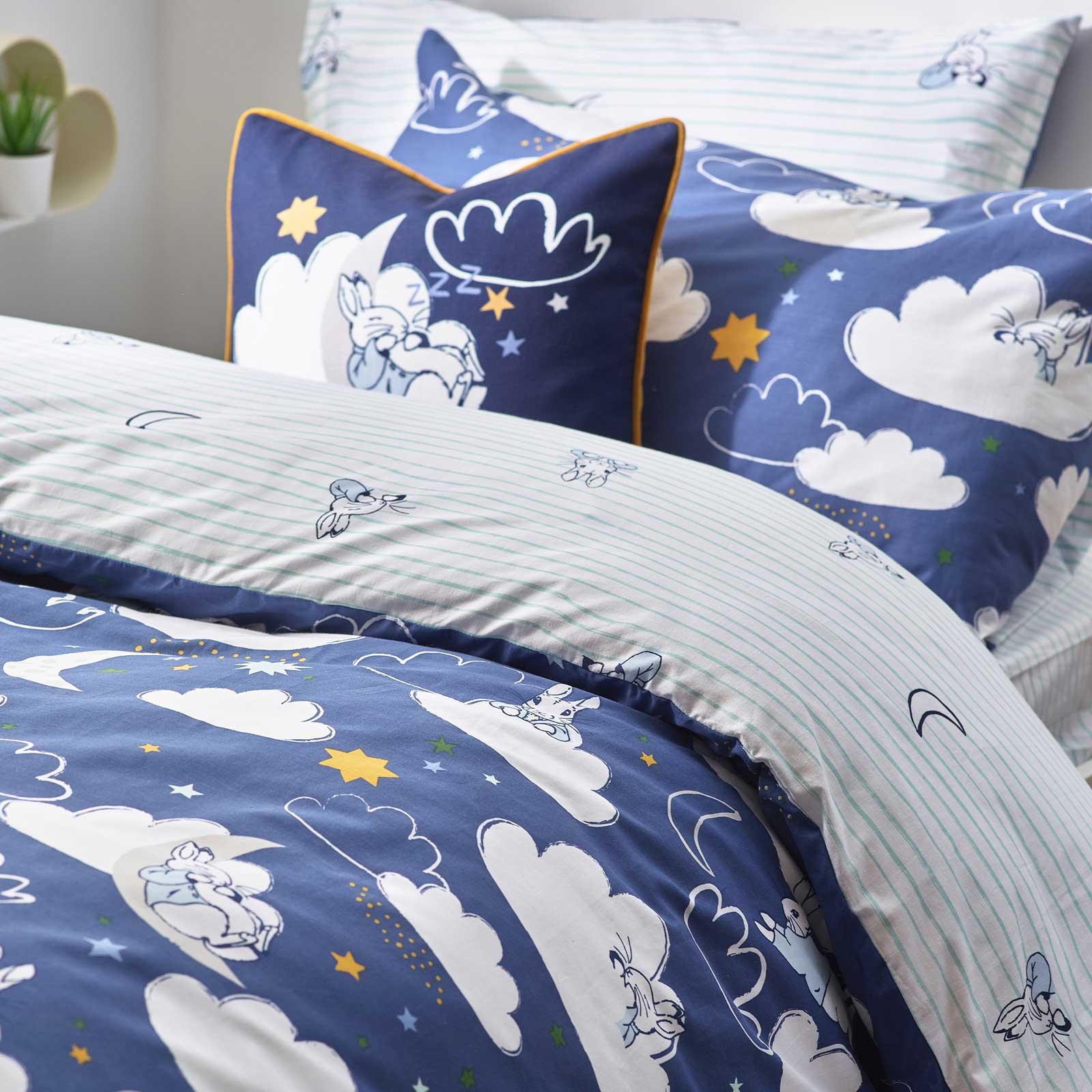 Step into the enchanting world of Beatrix Potter with this delightful duvet cover set featuring charming illustrations of Peter Rabbit sleeping peacefully under the moon and stars. After a day filled with playful adventures, Peter is depicted amidst a dreamy sea of clouds, inviting your little ones to join him in a restful slumber. The reverse side boasts an adorable pinstripe design of Peter tucked in, providing two delightful looks in one set to complement any child's bedroom décor.