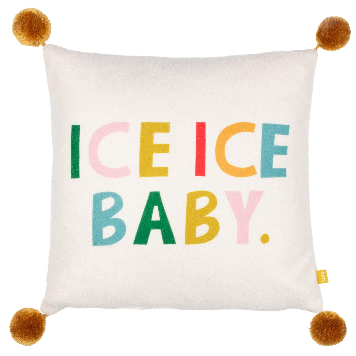 Add a touch of seasonal personality to your home with our Ice Ice Baby cushion cover. The multicoloured letters are printed onto soft boucle fabric, complemented by a plain reverse. Finished with big round pom poms on each corner and a zip fastening. Ideal for adding a bit of fun to your soft furnishings this winter.