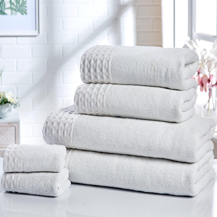 - 6 Piece Set includes two face cloths (30cm x 30cm), two hand towels (50cm x 80cm), and two bath towels (70cm x 120cm).