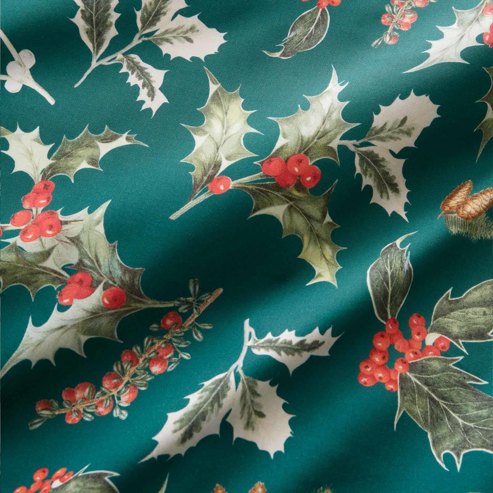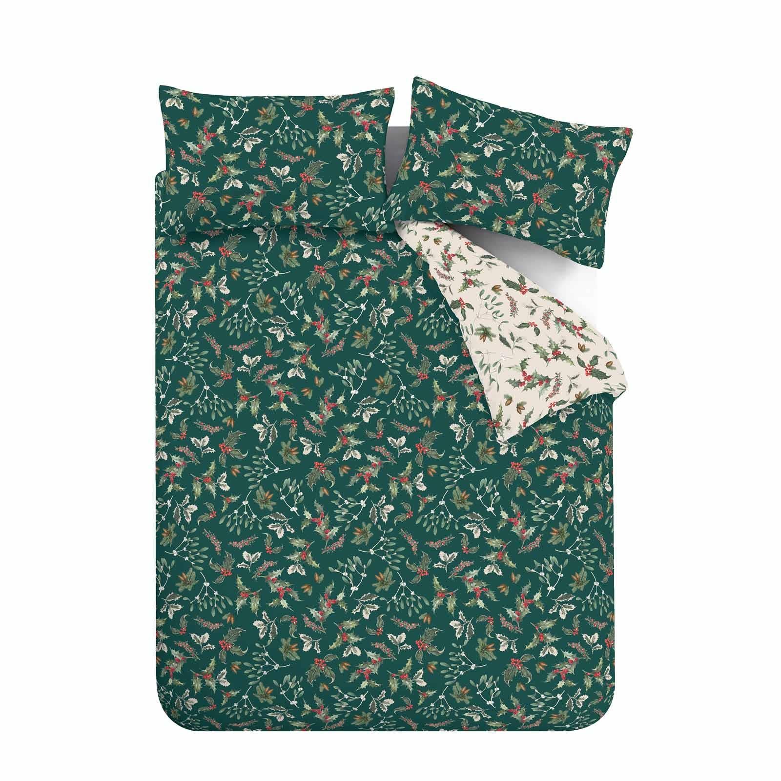 Adorned with a serene pattern of woodland festive mistletoe, this bedding set is designed to create a peaceful haven in your bedroom. The deep emerald backdrop, speckled with soft touches of white and crimson, brings the quiet splendour of a forest at dusk to your personal space. Digitally printed onto a soft, 200 thread count cotton, in a breathable percale weave. Complemented with a silhouetted neutral reverse offering season long allure.
