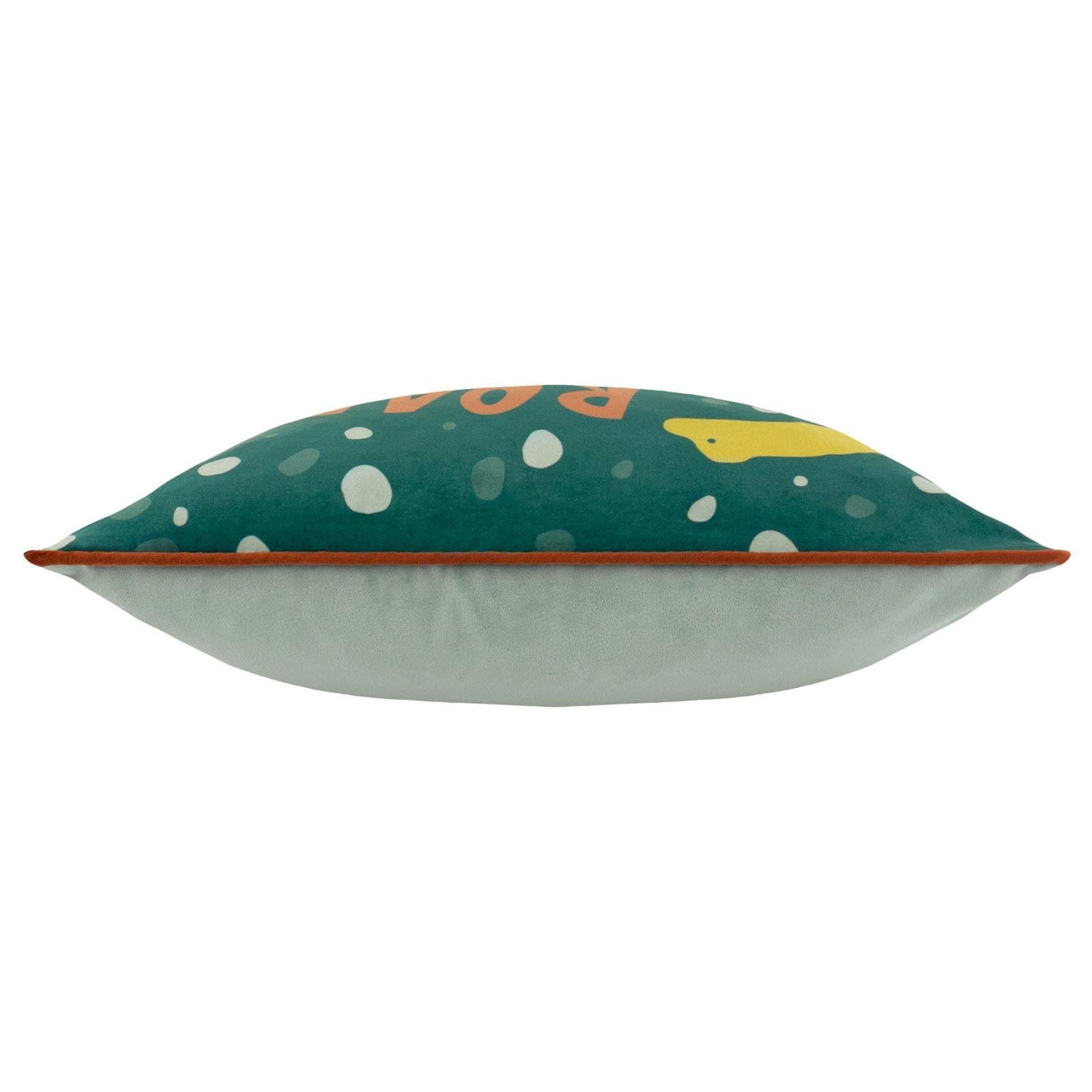 Surrounded by playful palms and prehistoric landscapes, the Little Dinos cushion features a brightly hand painted, printed plant-eating dinosaur letting out a ground shaking ‘ROAR’. Complete with a complementing sage green velvet reverse, this design sits perfectly with its coordinating duvet cover set and fitted sheet. A roar-some addition to any child’s bedroom!