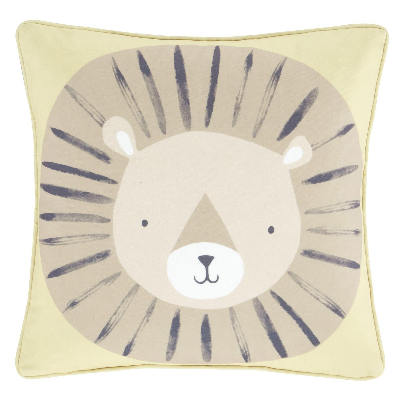 Add an extra layer of cuteness with this playful hand drawn lion in a scandi style. Fully reversible with a light yellow side and an alternative green side with piped detailing, a perfect fit for a safari themed room.