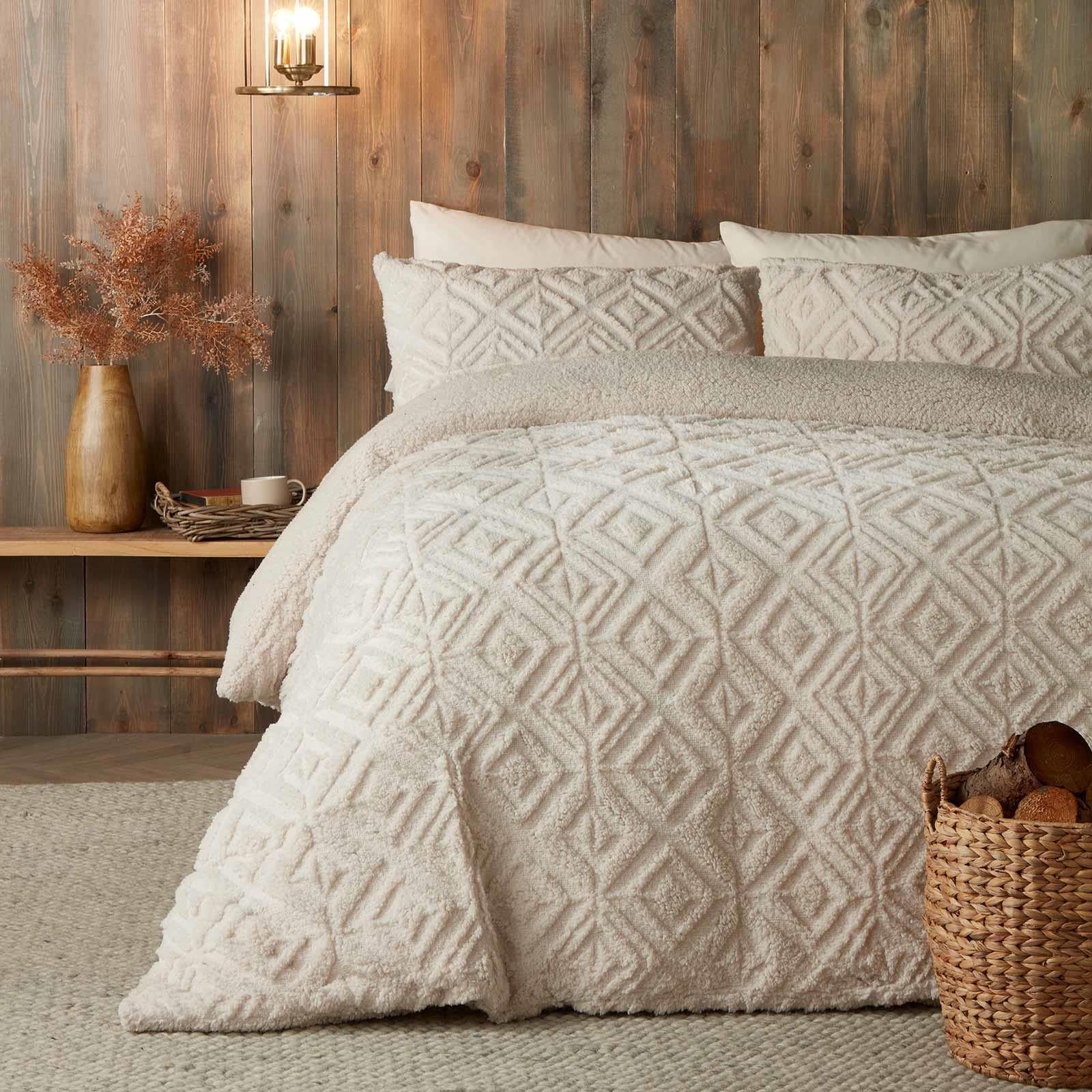 Experience the perfect balance of comfort and style with this luxurious duvet cover set. Crafted with an elegant pinsonic fleece front and a velvety soft plain sherpa reverse, it creates an indulgent and cosy haven for restful nights. Immerse yourself in the finest quality materials and expertly designed elements, evoking the sensation of sinking into a plush sanctuary. With this duvet cover set, every night transforms into a dream of unparalleled warmth and comfort, redefining relaxation and inviting you into a world of splendour.