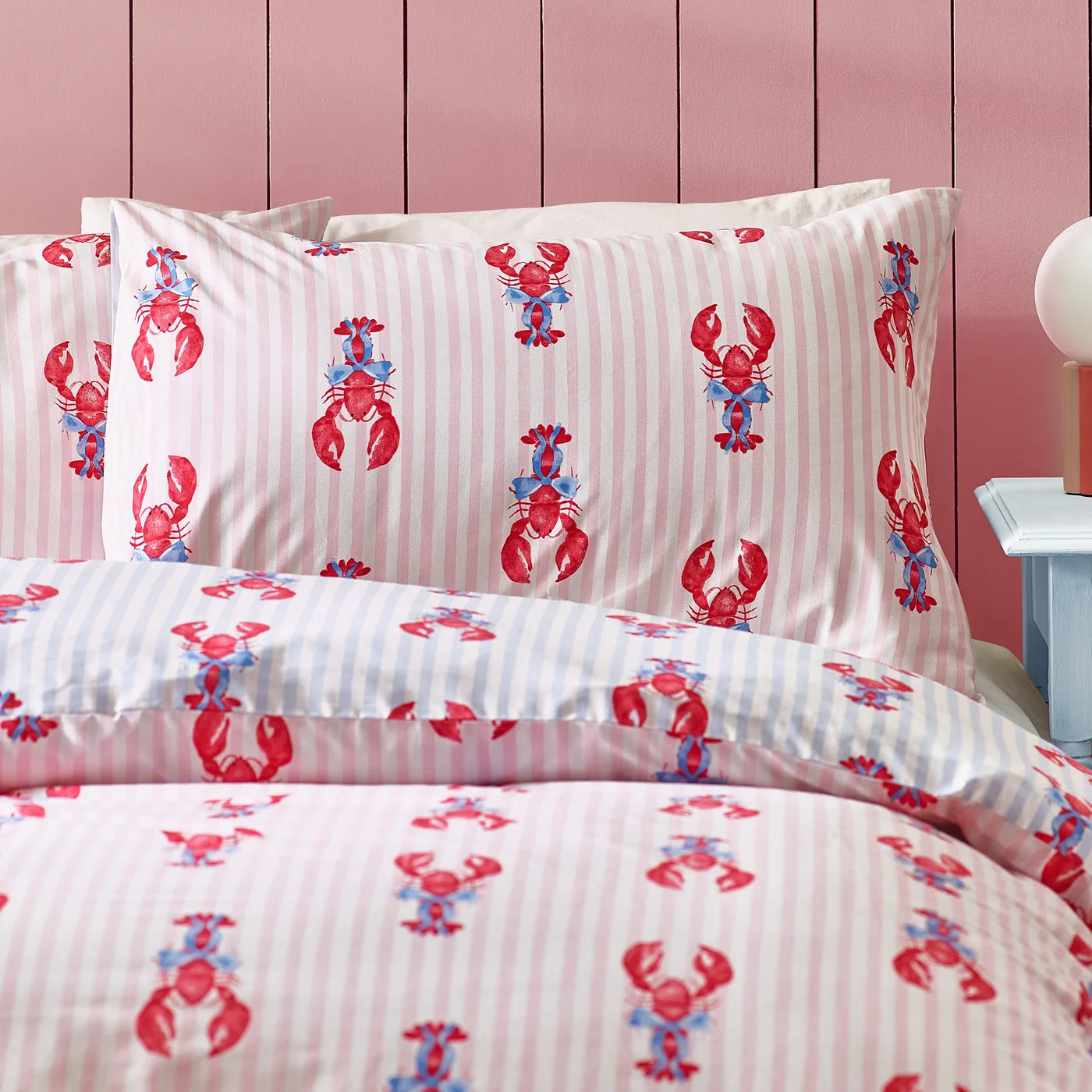 Bring a bold look to your bedroom with this quirky lobster print bedding. Featuring red or blue stripes decorated with lobsters in bows, this set is fully reversible for when you want to switch up your style.