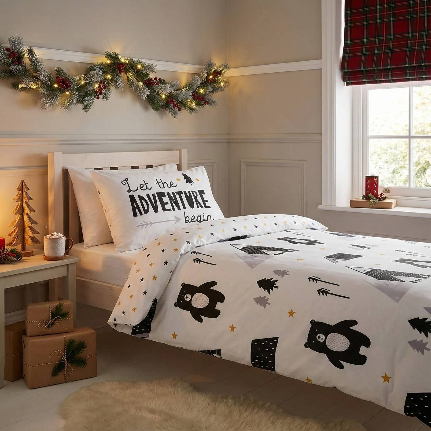 Stylish Scandinavian inspired bear and forest themed bedding set in mono colours with the slogan 'Let the adventure begin' on the pillowcase. Fully reversible.