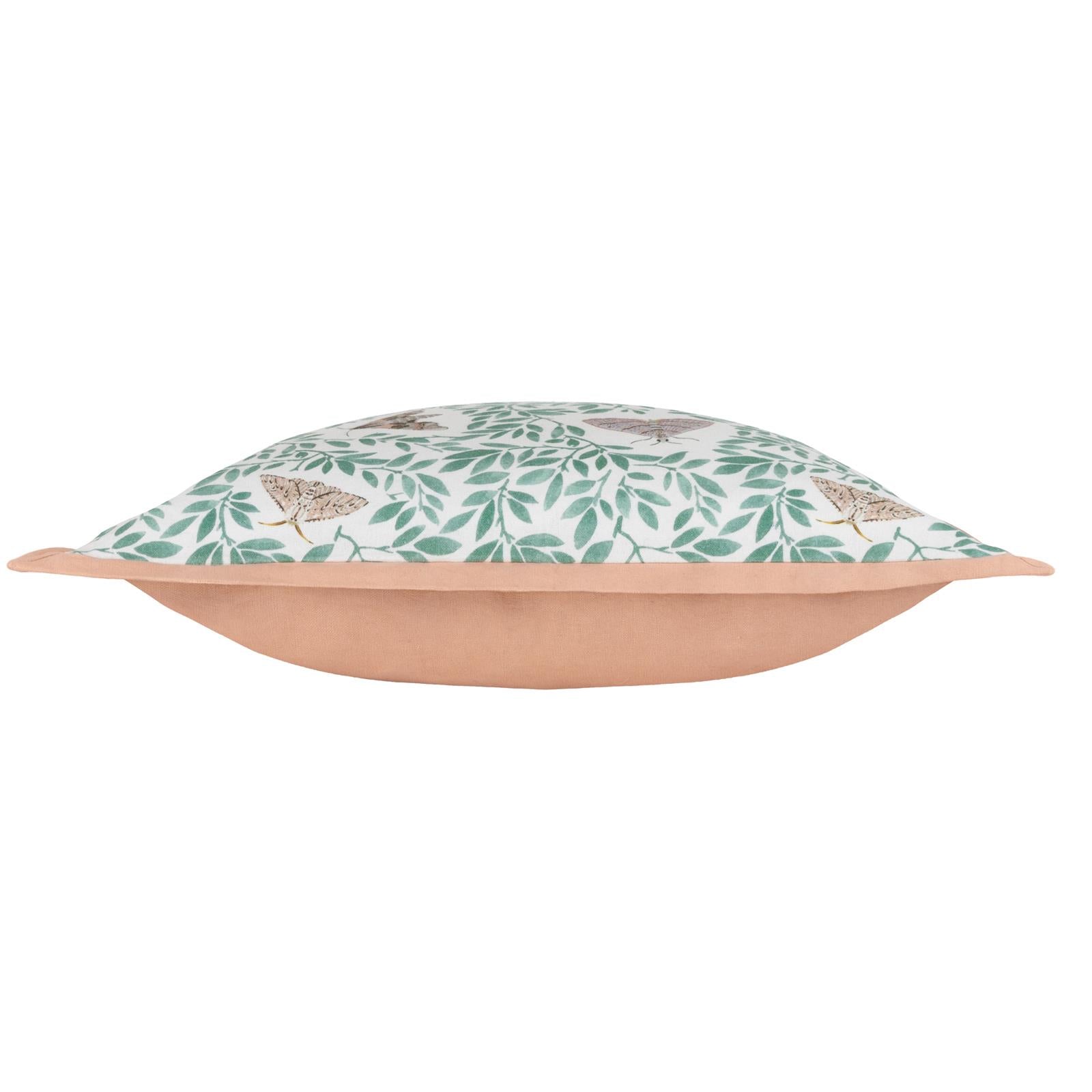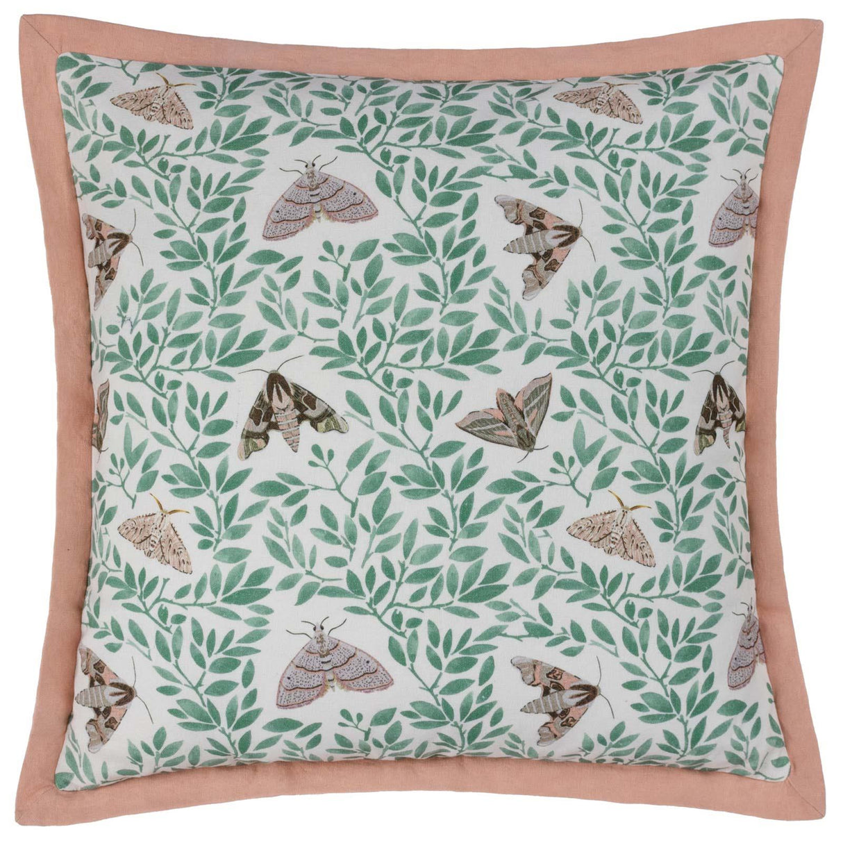 Purely inspired by nature, this beautiful cushion cover helps bring the outdoors, indoors. The fresh design features moths fluttering restlessly among the bright green leaves, on a clean white background and printed onto a soft cotton fabric. Finished with a complementing pastel pink oxford edge trim, this cushion is a fine way of adding a touch of nature to your home.