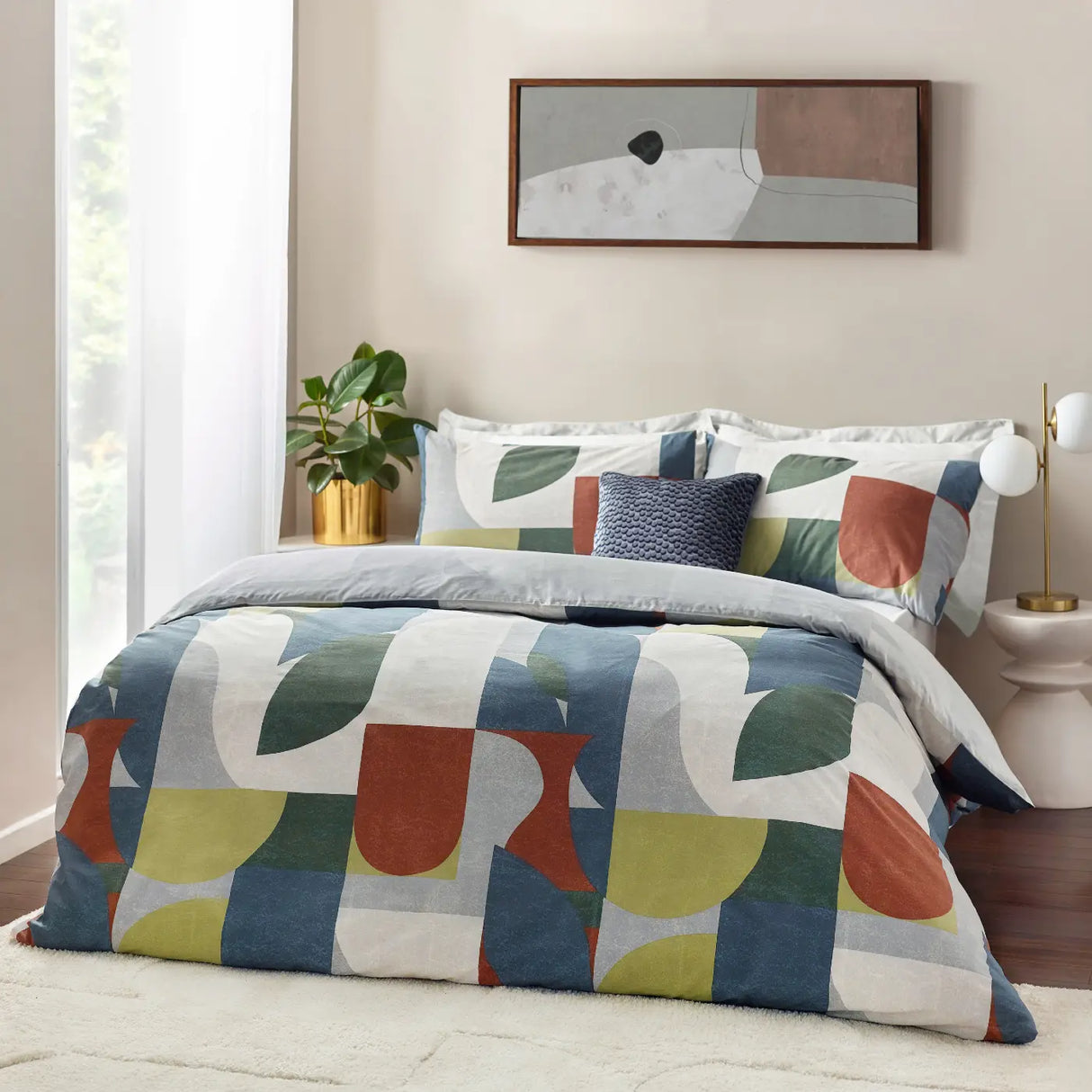 Refresh your bedroom with the Siresa duvet cover set, featuring a timeless design of abstract geometric shapes in beautiful nature-inspired tones. This versatile set is fully reversible, offering a more understated look on the flip side to easily change your room's style. Made from a soft yet durable 60% cotton and 40% polyester blend, it's designed for both comfort and longevity. Finished with a simple button fastening and certified Standard 100 by OEKO-TEX®, you can enjoy a stylish and sustainably made product.