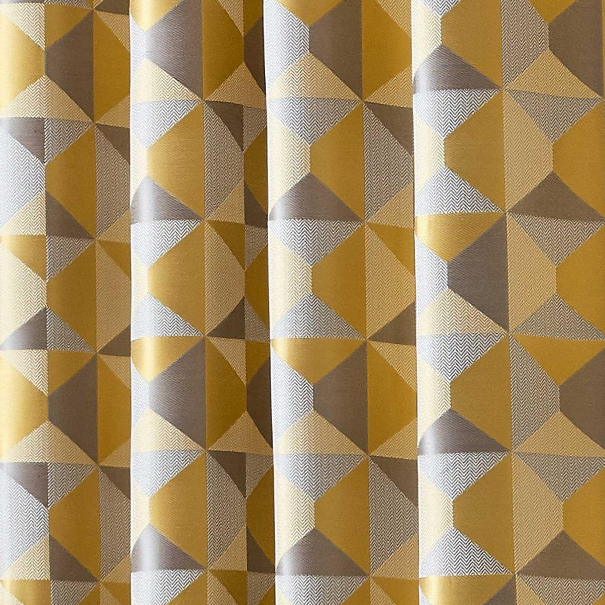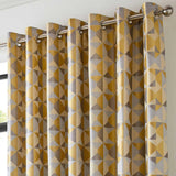 The Skandi range of eyelet curtains feature a contemporary geometric design beautifully woven into a multi-weave jacquard fabric in shades of ochre yellow and grey. These curtains are fitted with an eyelet ring top heading for use on a curtain pole and are fully lined. Matching cushion covers available in two sizes.
