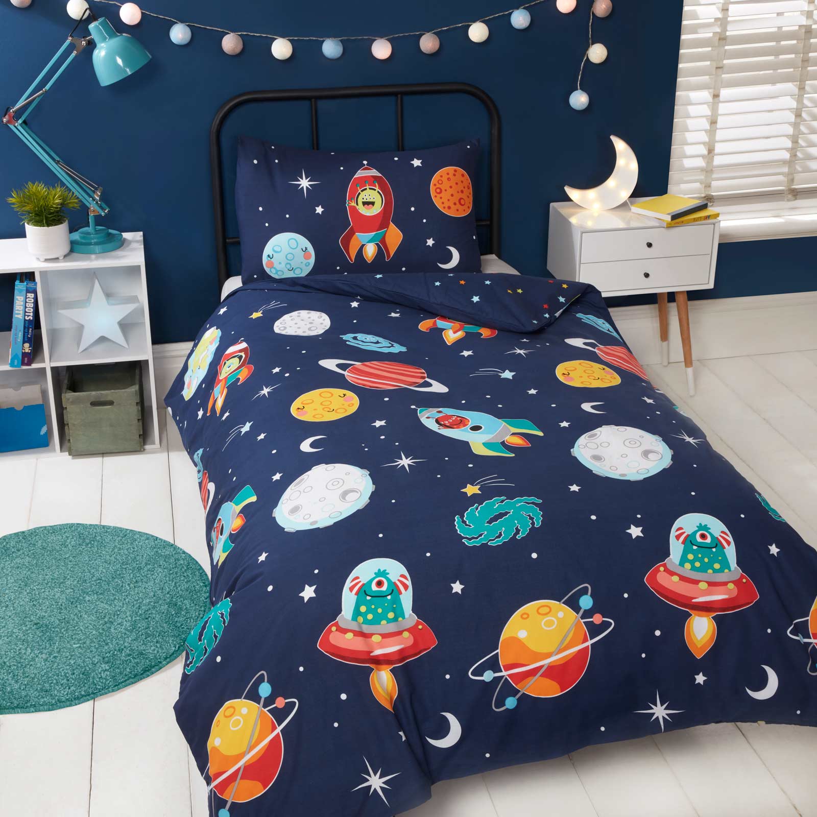 Our Space & Aliens duvet cover is an exciting glow in the dark space themed bedding set featuring planets, stars, and aliens in a space ship, printed on a dark blue background. This fun glow in the dark duvet cover set will be the perfect addition to your child's bedroom.