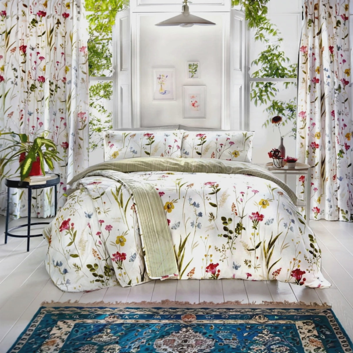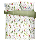 A hand painted delicate floral meadow with a fresh mix of bright spring colours, printed onto crisp easy care polycotton white fabric. This vibrant bedding will bring colourful warmth to your bedroom and is fully reversible with contrasting vertical green stripes.