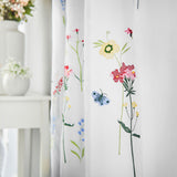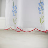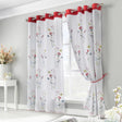 These Springfield curtains feature multicoloured floral embroidery on lightweight organza voile, lined with white polyester fabric. Ring top eyelet header, red taffeta heading and red scalloped bottom trim complete the look. Tie backs not included.
