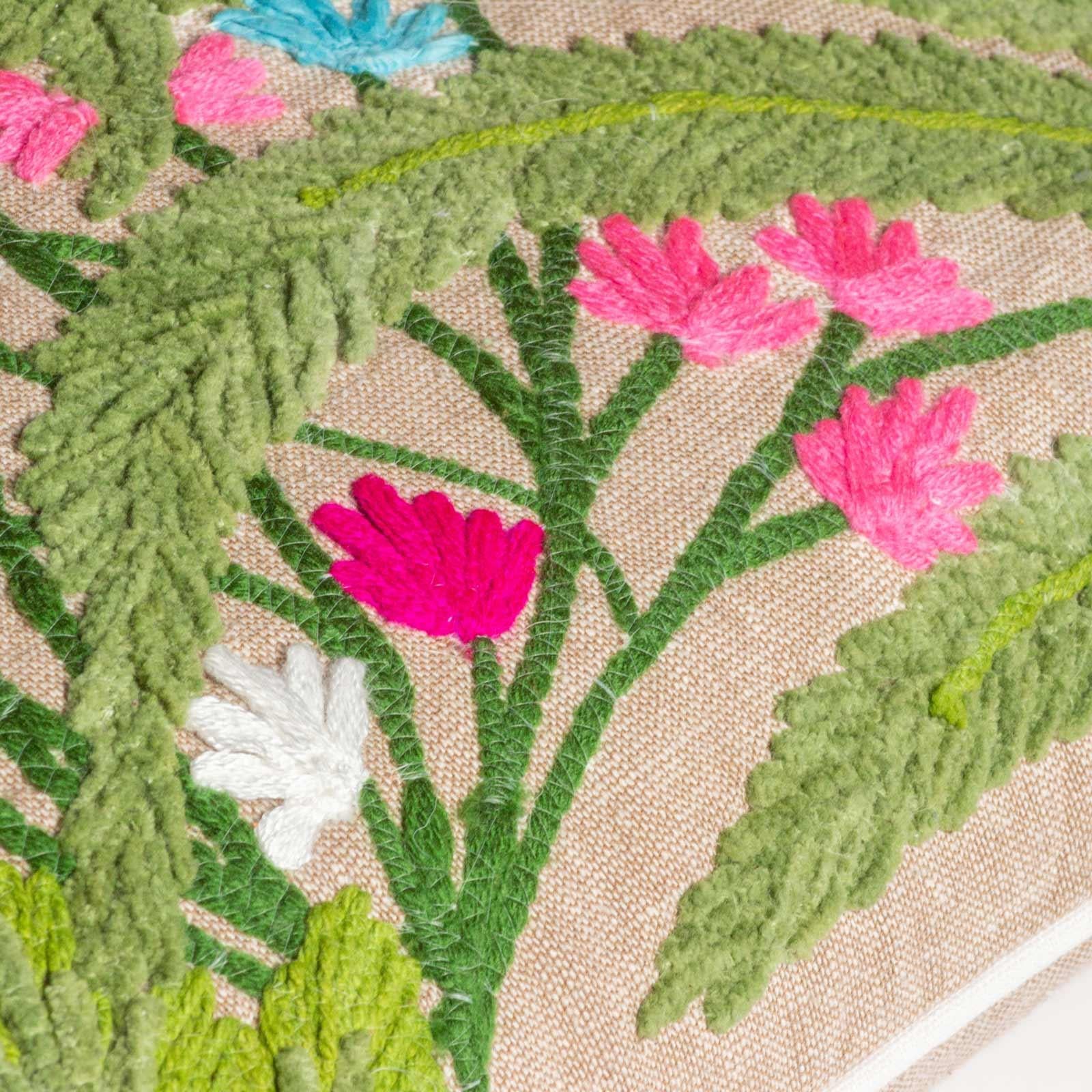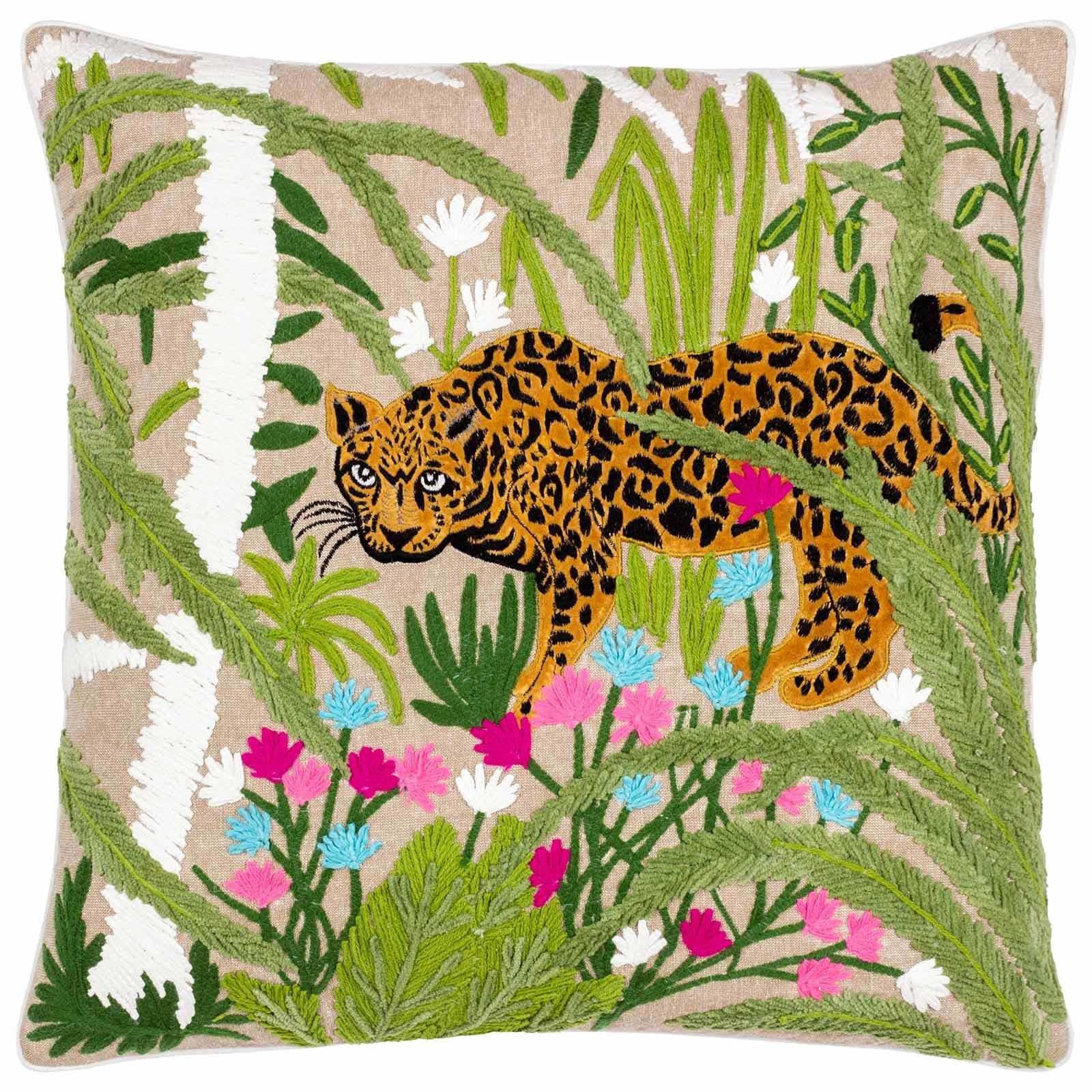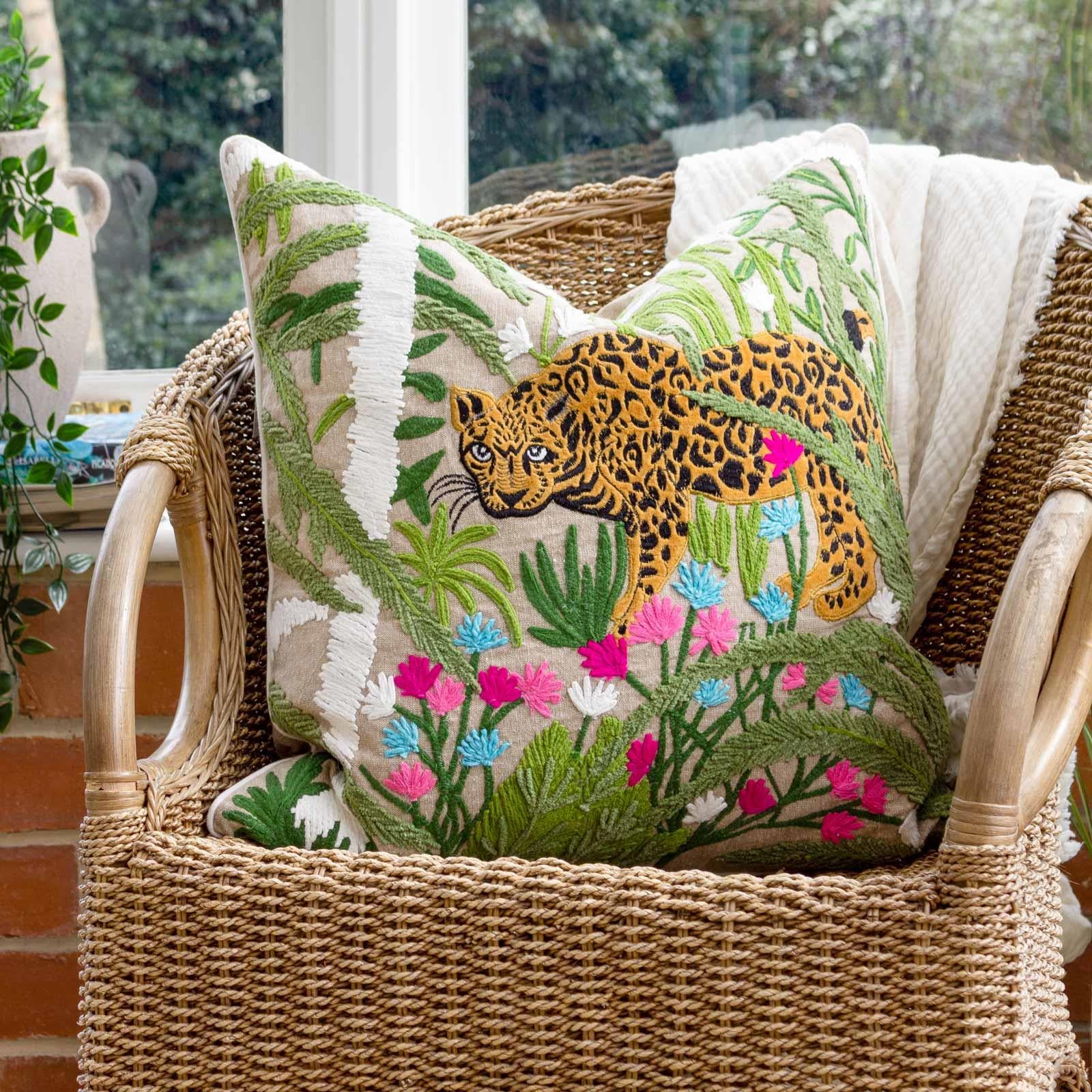 The Sulta cushion cover features an embellished applique and embroidered scene of a prowling Leopard with its eyes firmly locked on its prey, as it waits, ready to pounce amongst the bright, lush jungle florals. Sewn onto a soft, linen look base, this tropical trend led design makes a great statement piece that can become the central point of your home furnishings.