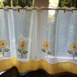Light and airy Sunflower cafe curtain panel featuring a cheery floral embroidered design and gingham trim to the bottom. These panels are complete with a stitched eyelet heading for use on a net rod or thin pole.