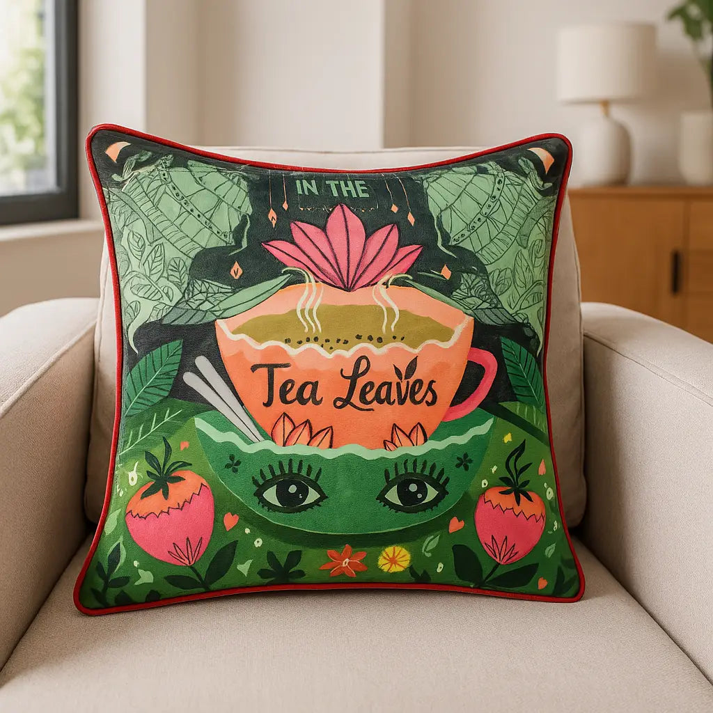 An amazingly intricately designed cushion cover featuring two ornate teapots pouring tea into a cup. The saucer has eyes, which perhaps like the tea leaves, can see into the future! A wonderful design, printed on a luxurious opulent velvet base and rounded off with tightly woven piping around the edge. A characterful addition to your home furnishings.
