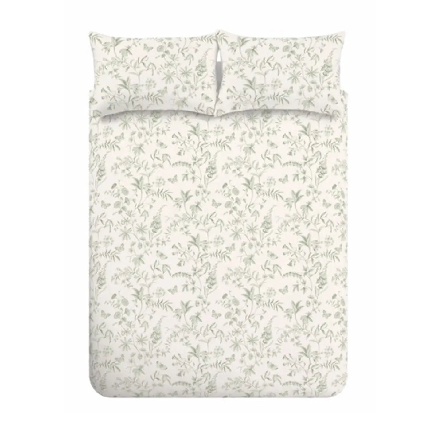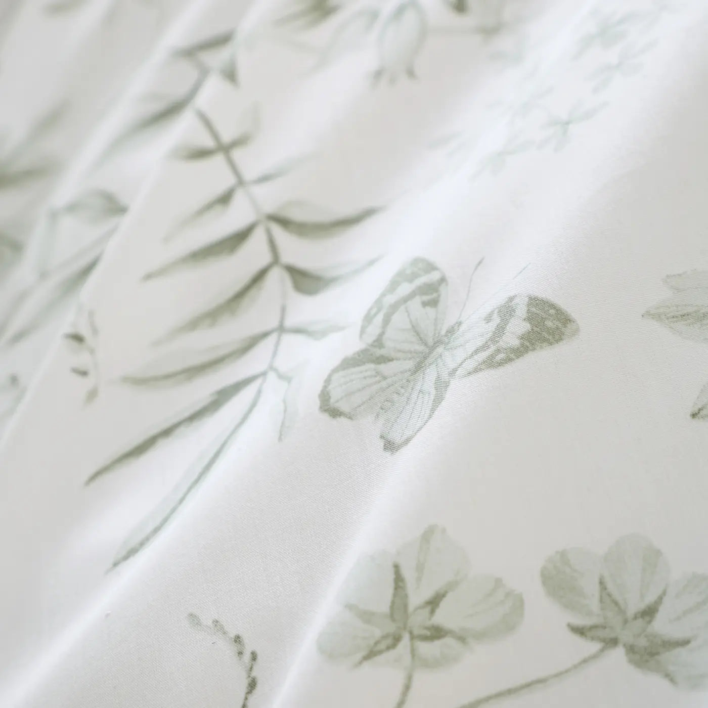 Transform your bedroom into a tranquil oasis with our enchanting floral duvet cover. Featuring a delightful wild garden design, this bedding showcases intricate green patterns and whimsical butterflies against a soothing natural backdrop. Its fully reversible feature allows you to switch up your style effortlessly, while the luxurious 200 thread count percale cotton ensures a soft and breathable sleeping experience. Indulge in the comfort and elegance that this duvet cover brings to your home.