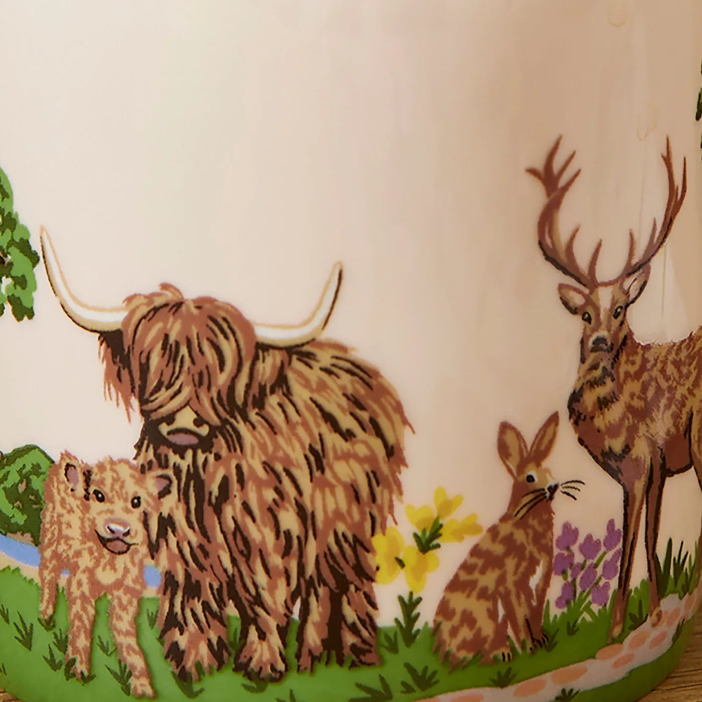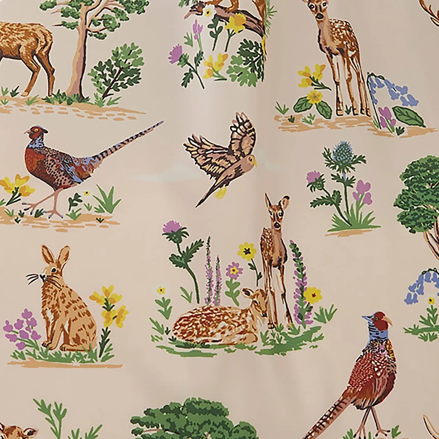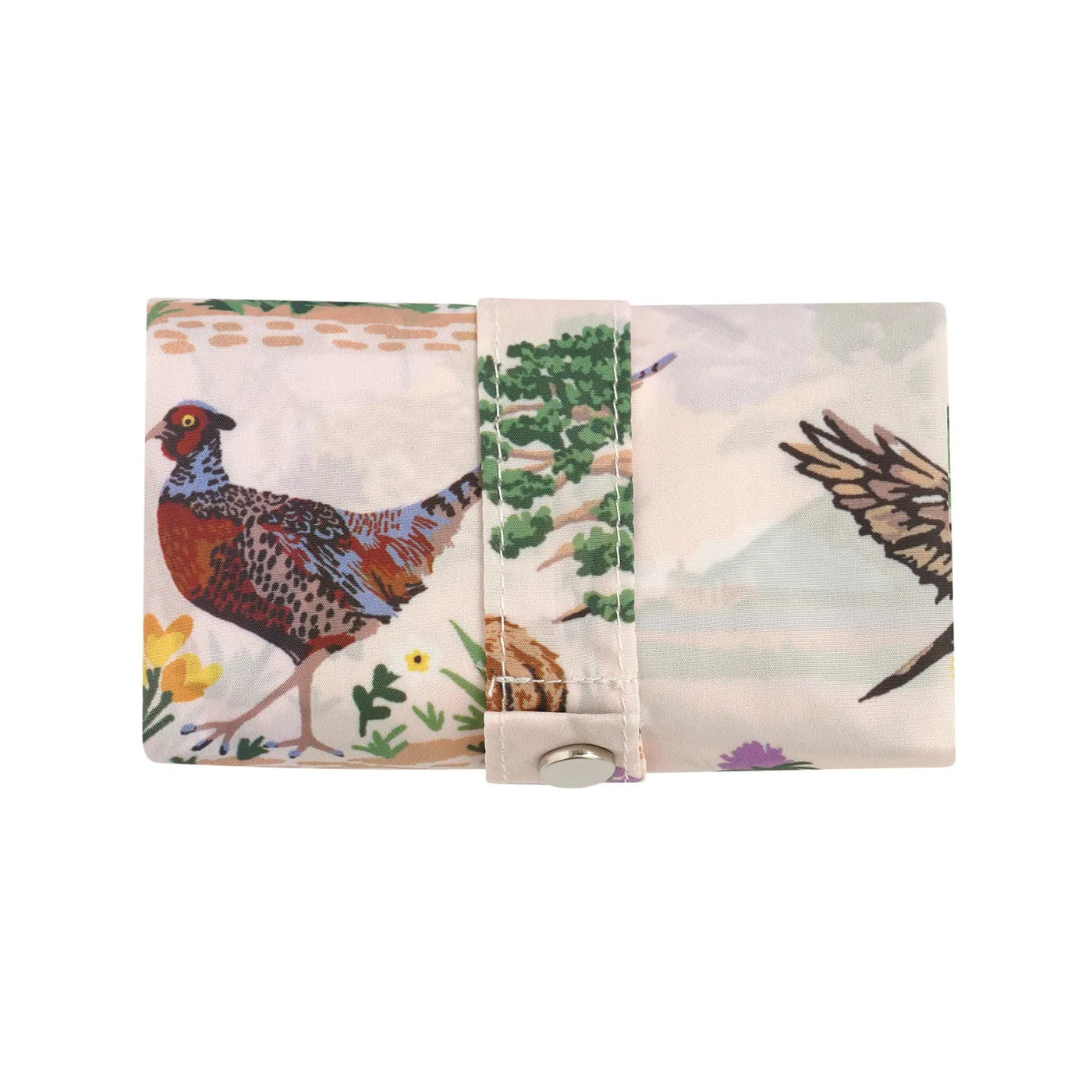 It features a nature-inspired Thistlewood print with birds, trees, farmyard motifs, and floral details in green tones.