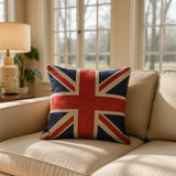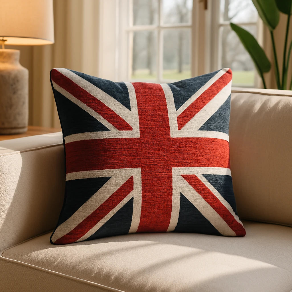 A fun and quirky chenille cushion cover featuring the Union flag. Beautifully textured and soft to the touch in the classic red white and blue colours.