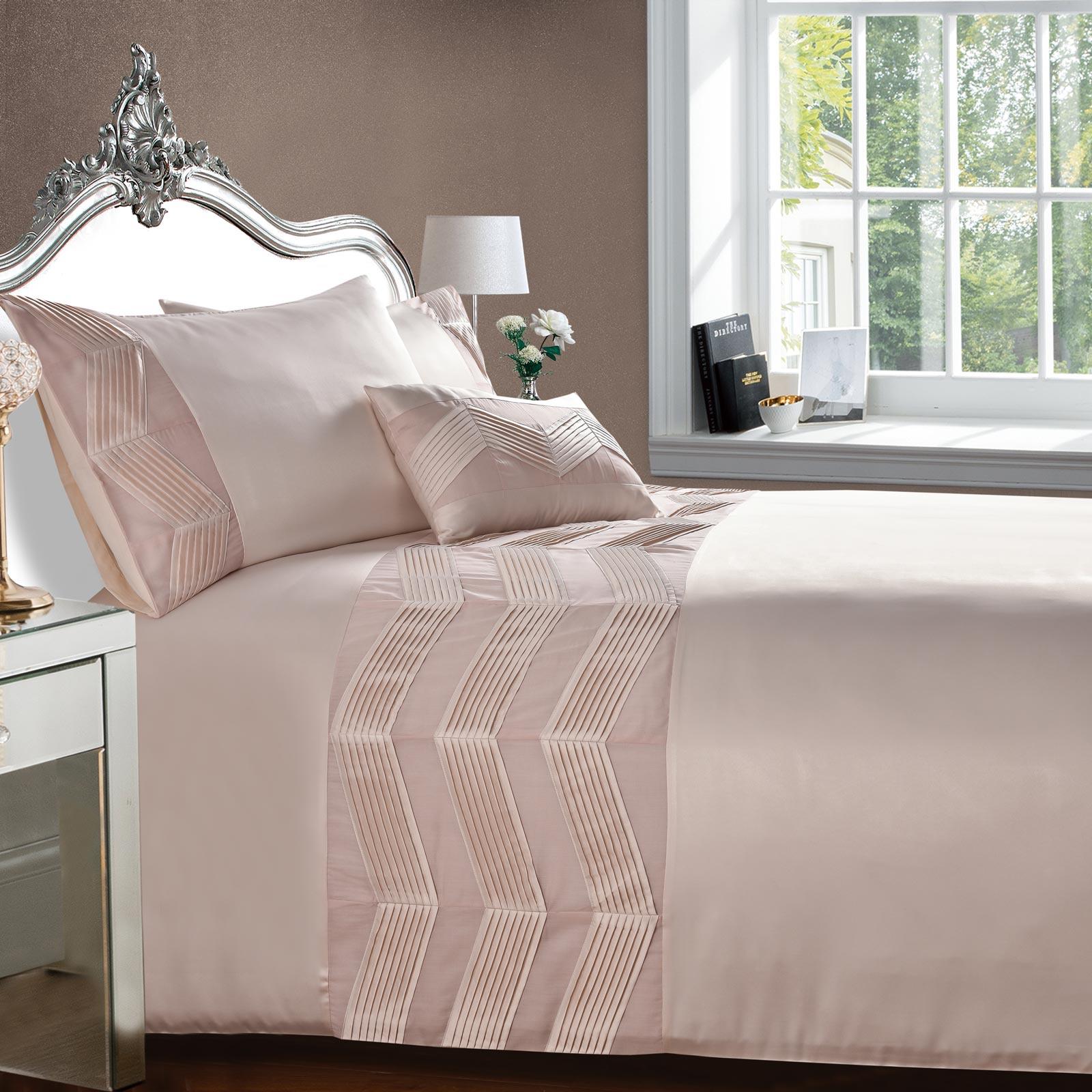These elegant Valencia duvet covers have been beautifully made from a blush pink satin style fabric featuring a chevron pleating band across the duvet and down each pillowcase, the perfect addition to any boudoir bedroom.