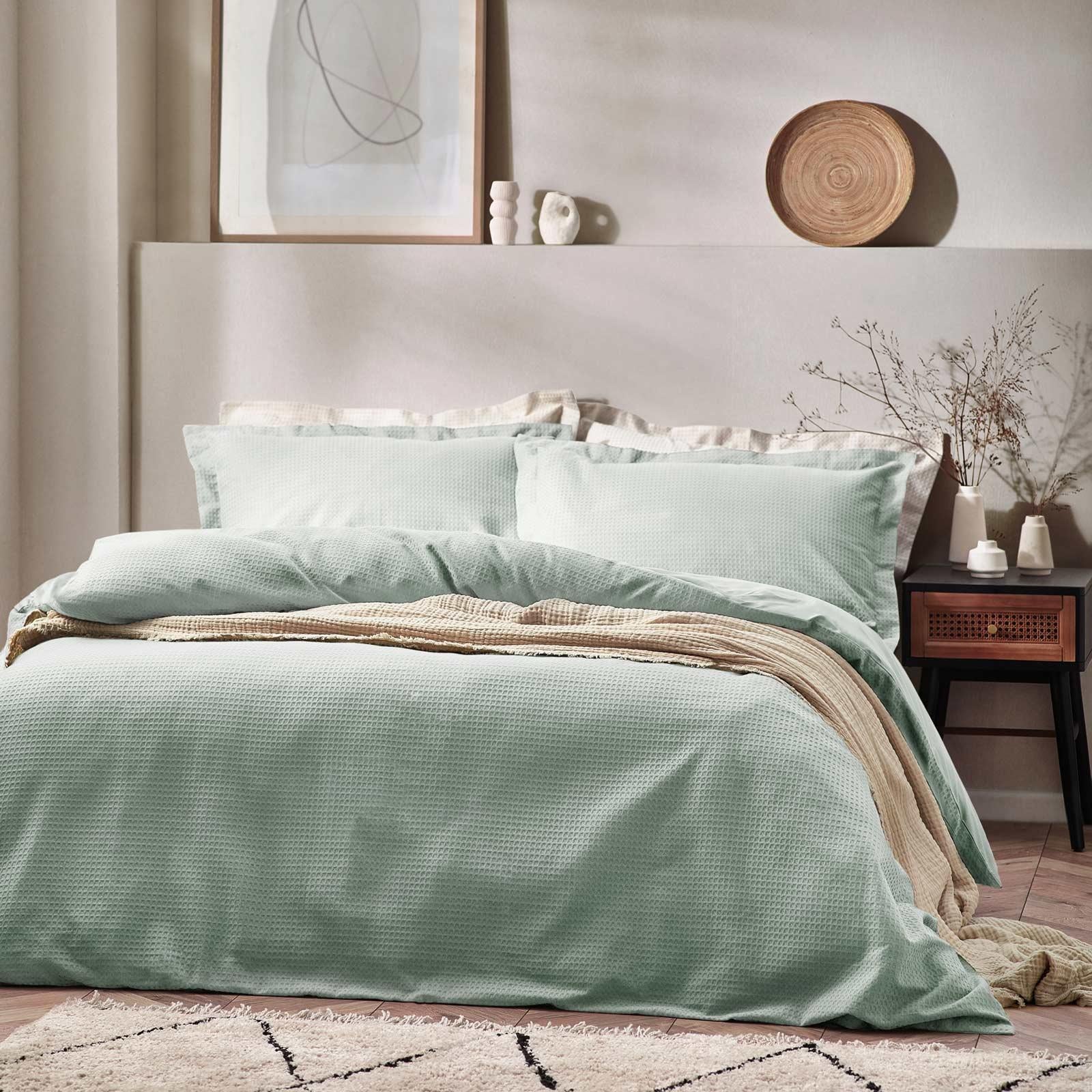 Transform your bedroom into a serene sanctuary with this exquisite duvet cover set, crafted from soft, durable cotton and featuring a distinctive 3D waffle weave design. The elegant Oxford border adds a touch of sophistication, making it a perfect centrepiece for any bedding ensemble. Designed to provide comfort year-round, the unique waffle texture offers thermal properties that keep you snug on chilly nights while remaining breathable during warmer seasons. Available in a range of soothing colours, this duvet cover set not only enhances the aesthetic of your bedroom but also promotes a tranquil atmosphere for restful sleep.