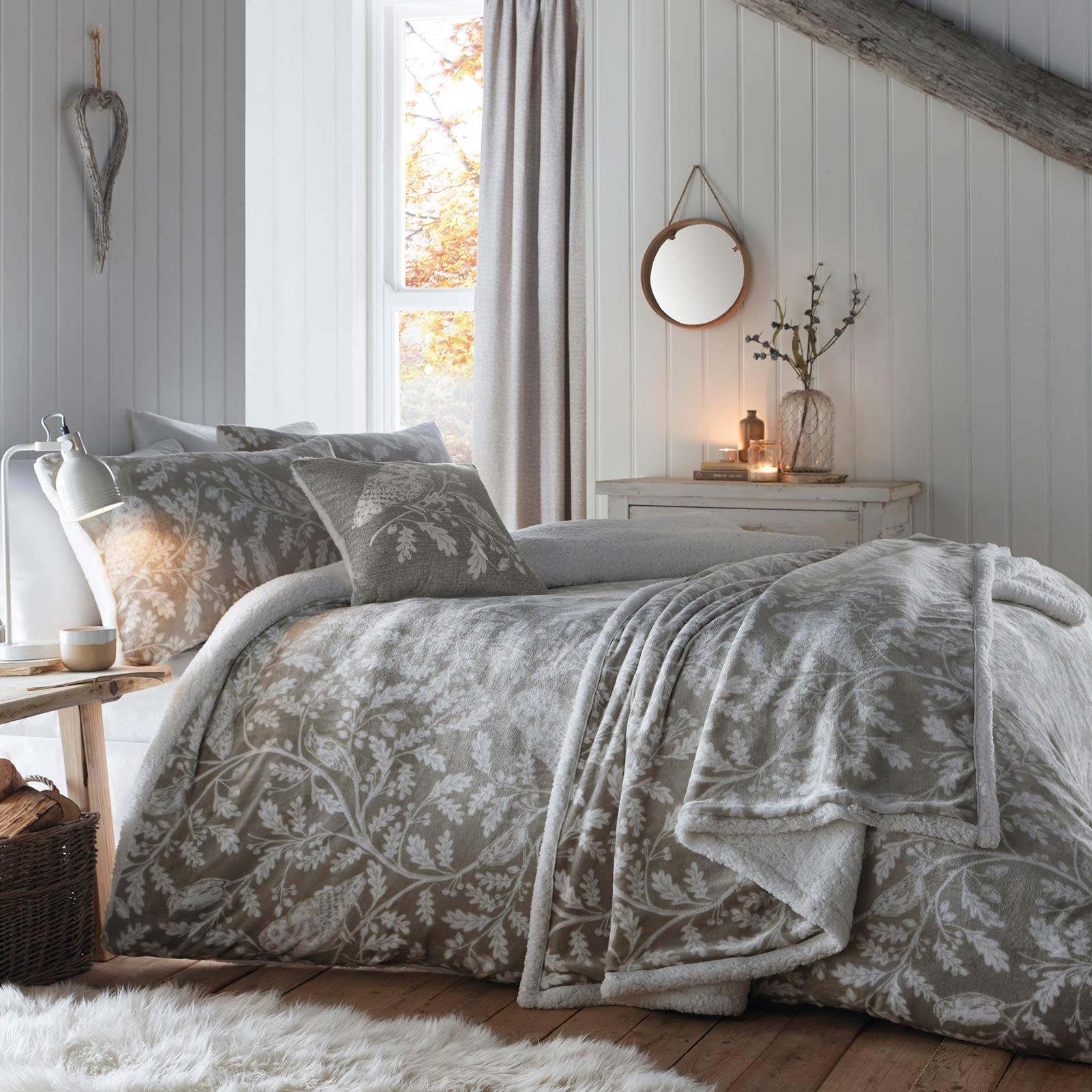 Transform your bedroom into a cosy woodland retreat with this stunning duvet cover set featuring charming woodland birds nestled among lush fauna. Crafted from incredibly soft touch fleece fabric, this bedding set promises warmth and comfort for a restful night's sleep. The luxurious sherpa reverse enhances the snuggly experience, making it perfect for those chilly nights.